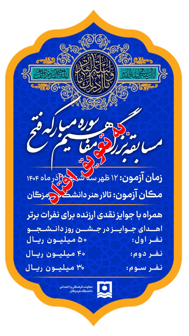 اطلاعیه به تعویق افتادن زمان برگزاری «مسابقه بزرگ مفاهیم سوره مبارکه فتح»