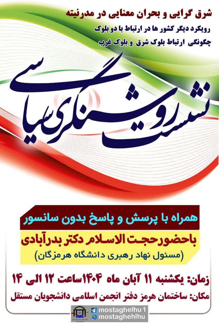 انجمن اسلامی دانشجویان مستقل دانشگاه هرمزگان میزگردی با عنوان «وقتی معنا در مدرنیته غربی به بحران می‌رسد، آیا شرق می‌تواند افق تازه‌ای بگشاید؟» برگزار می‌کند. این نشست با حضور حجت‌الاسلام همت بدرآبادی، مسئول محترم دفتر نهاد نمایندگی مقام معظم رهبری در دانشگاه هرمزگان برگزار خواهد شد.