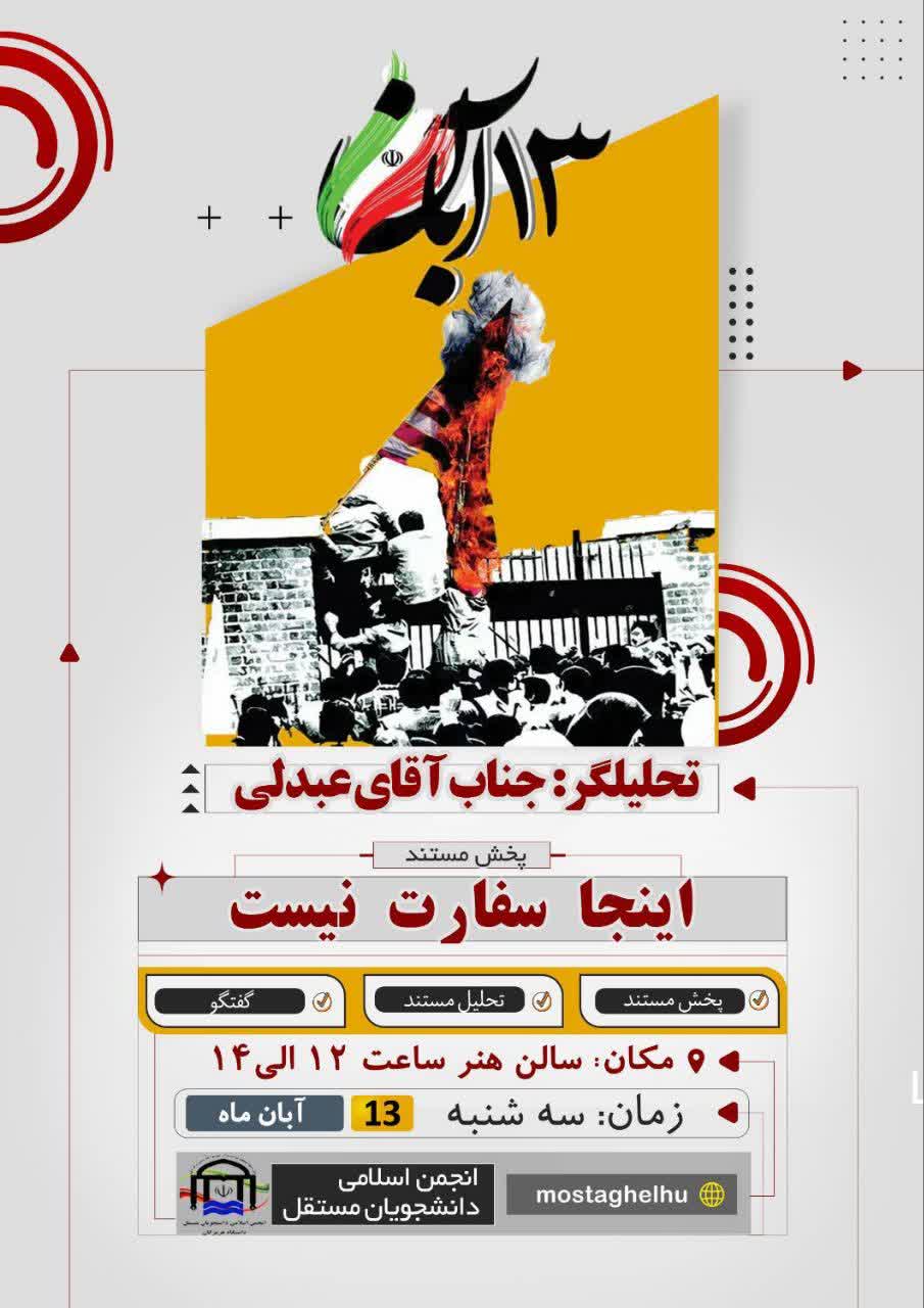 به مناسبت فرارسیدن سالروز سیزدهم آبان، انجمن اسلامی دانشجویان مستقل دانشگاه هرمزگان برنامه‌ای فرهنگی–دانشجویی را با هدف بازخوانی رویدادهای تاریخی و تقویت بینش تحلیلی نسل جوان برگزار می‌کند. در این رویداد، مستند تحلیلی و دیدنی «اینجا سفارت نیست» با حضور و کارشناسی جناب آقای عبدلی به نمایش گذاشته خواهد شد.