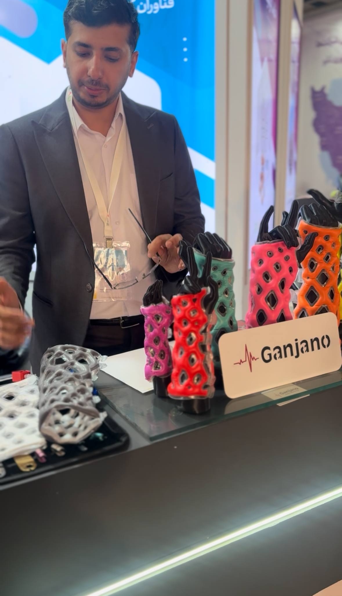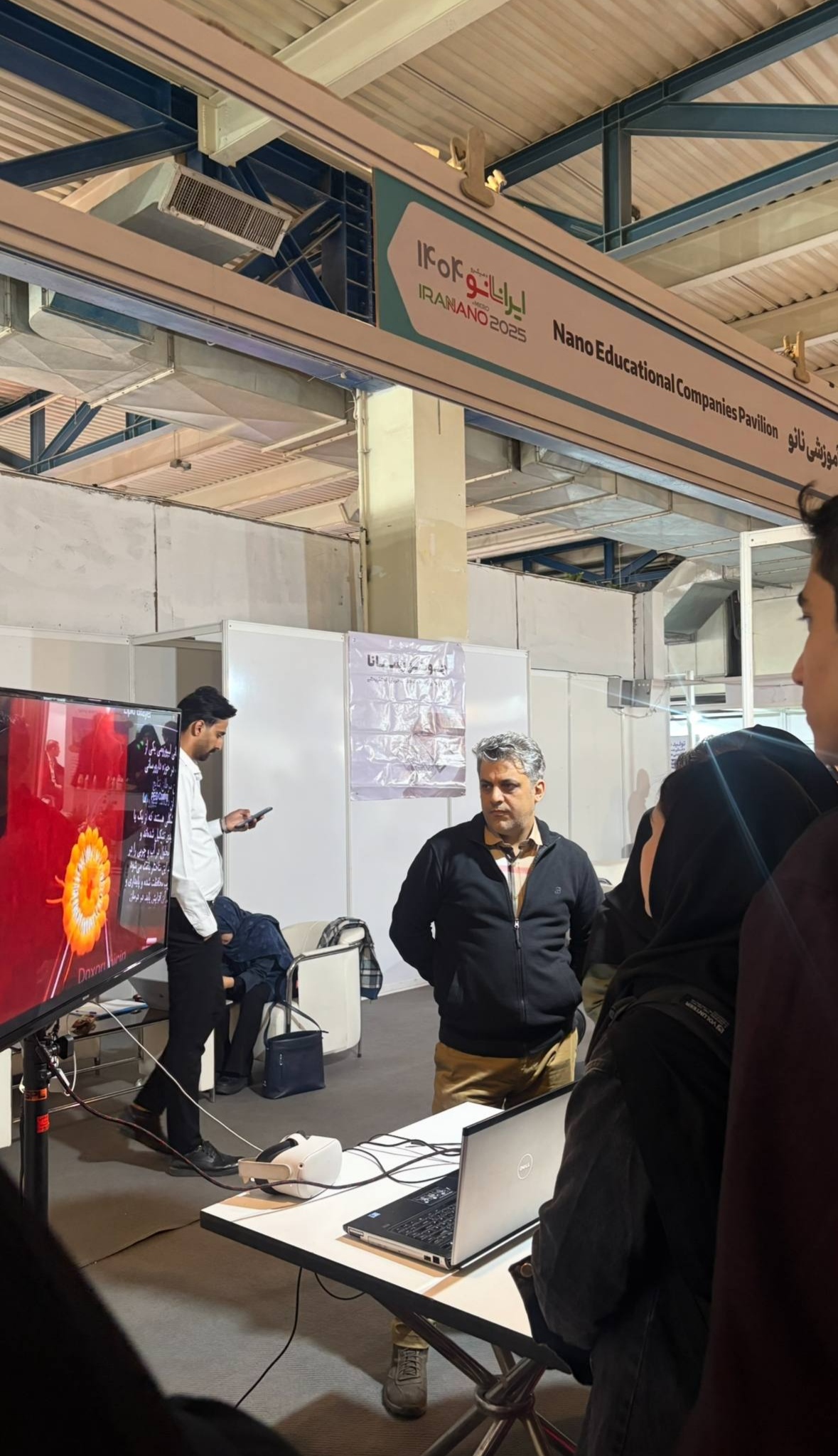 در بخش دیگری از بازدید، آقای جابر سادگی—مدرس نمایشگاه، رابط نهاد ترویجی نانو در هرمزگان، دارنده مدال طلای مسابقات ملی فناوری نانو و فارغ‌التحصیل دانشگاه هرمزگان—به‌عنوان راهنمای علمی همراه گروه بود و با معرفی تخصصی غرفه‌ها، مسیرهای نوآوری و کاربردهای صنعتی فناوری نانو را برای دانشجویان تشریح کرد.