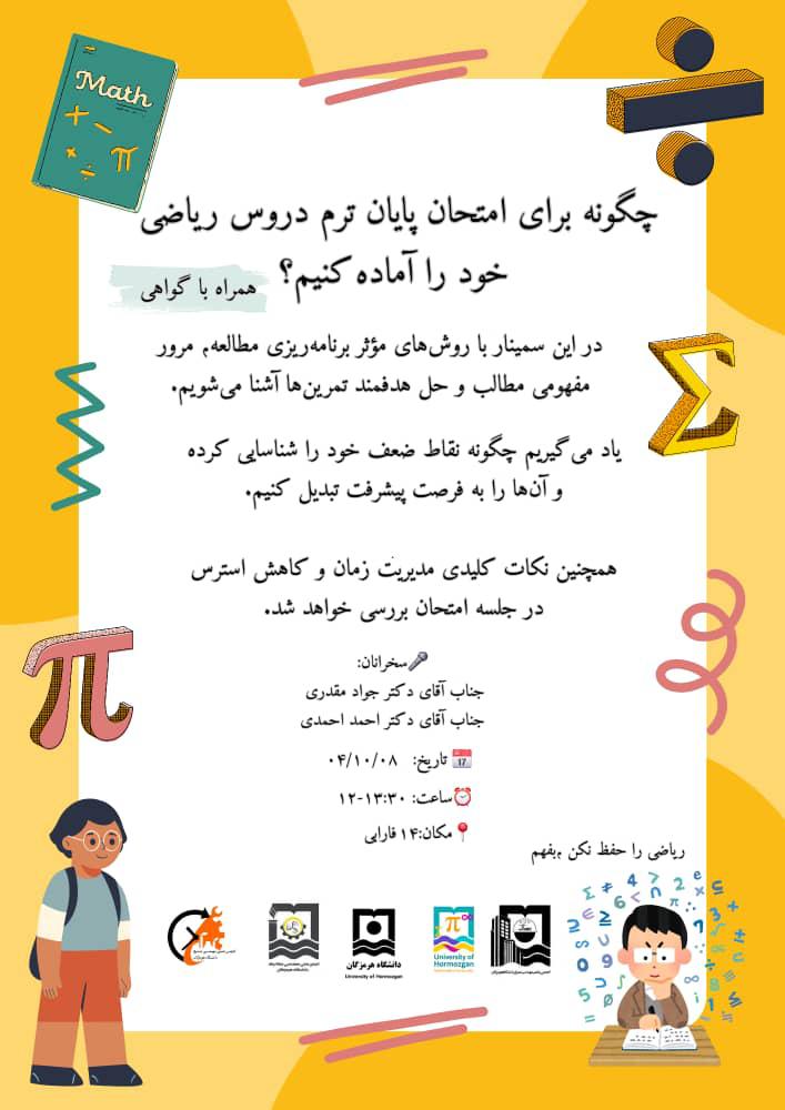 کارگاه آموزشی «چگونه برای امتحان پایان‌ترم دروس ریاضی خود را آماده کنیم؟» با همکاری انجمن‌های علمی مرتبط، روز دوشنبه ۸ دی‌ماه ۱۴۰4 از ساعت ۱۲:۳۰ در کلاس ۱۴ فاز اول برگزار می‌شود. در این برنامه، روش‌های مطالعه مفهومی، مدیریت زمان و کاهش استرس امتحان ارائه شده و به شرکت‌کنندگان گواهی معتبر اعطا خواهد شد.