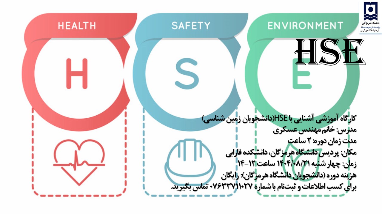در ادامه سلسله کارگاه‌های آموزشی ایمنی، آزمایشگاه مرکزی دانشگاه هرمزگان دوره HSE (ایمنی، بهداشت و محیط‌زیست) را این بار ویژه دانشجویان جدیدالورود رشته زمین‌شناسی برگزار می‌کند.